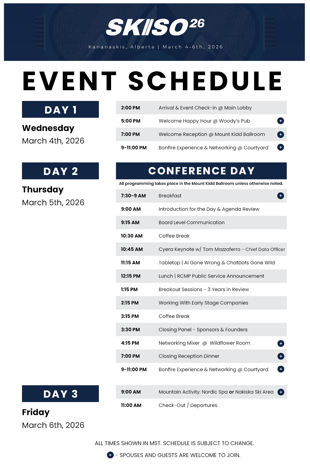 Our programming on Thursday is closed to attendees and sponsors only, however, guests are welcome to join us for our Welcome Happy Hour, Welcome Reception, Breakfast, Networking Mixer, Closing Reception and of course, their choice of spa and ski excursion on Friday. Please consult the attached scheduled for full details.